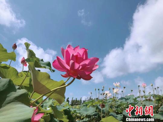 中新网上海7月12日电 (记者 缪璐)“接天莲叶无穷碧,映日荷花别样红。”坐落于上海西南门户的松江区新浜镇再现映日荷花、碧叶连天的唯美景致。