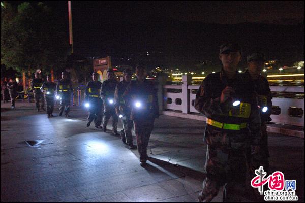 “马上有一次洪峰经过,请大家注意安全,立即退出警戒线内。”11日晚22时,大中坝沿嘉陵江一线由于受洪灾影响临时断电,一支十人民兵小分队沿江巡查,并耐心劝退沿线观水的所有群众。民兵向金玉告诉记者,他们队伍将整夜值守巡查,全力保障人民群众安全。