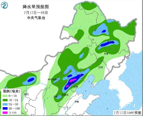 预计17日至18日,北京、河北中北部、天津北部及黑龙江中部和南部等地仍有大雨或暴雨,北京东北部和西南部、河北东北部等局地有大暴雨;上述地区累计降水量30~70毫米,局地可达100~150毫米;最大小时降水量30~50毫米,局地70毫米以上。华北地区降雨主要出现在今天白天到明天凌晨。中央气象台继续发布暴雨蓝色预警。