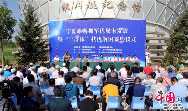 活动中,宁夏旅游协会景区分会发出‘三群体’帮扶解困倡议,宁夏旅游协会各分会分别与宁夏军区政治工作局签订“三群体”优先就业协议,与会领导向“三群体”重点优扶对象代表免费发放宁夏旅游拥军优属卡。