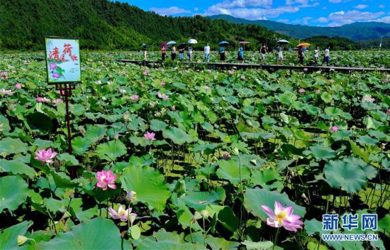 7月19日,游客在武夷山市五夫镇“清风荷塘”主题公园游览。 近年来,福建省武夷山市五夫镇把发展特色种植和传统文化结合起来,通过大面积种植荷花,打造“清风荷塘”主题公园,促进了乡村旅游的发展。 新华社记者 张国俊摄