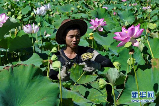7月19日,武夷山市五夫镇莲农在荷塘里采莲。 近年来,福建省武夷山市五夫镇把发展特色种植和传统文化结合起来,通过大面积种植荷花,打造“清风荷塘”主题公园,促进了乡村旅游的发展。 新华社记者 张国俊摄