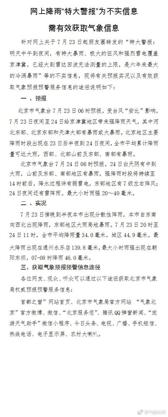 中新网7月24日电 北京市气象局官方微博今日进行辟谣,称网上有关北京降雨的“特大警报”信息,均为不实信息。请大家根据正确途径,来获取北京市气象局权威预报预警服务。