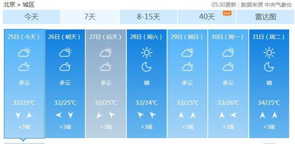 未来一周北京都是晴或多云天气,白天的最高气温在32-34℃之间,夜间的最低气温在24-26℃,体感闷热,公众需注意防暑降温。