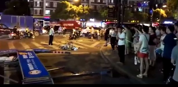 十字路口的东北侧,正好有一家“我爱我家”的店,事故发生时店里的店员听到了一声巨响,出来看,这辆车在竞舟路的北面,当时它边上还有辆车,路口马上变成红灯了,边上这辆车停下来等红灯了,这辆车竟然快速冲过去了,以很快的速度冲过去时带倒了北面路口的一个遮阳棚,幸好那个帐篷下面没有人。冲过去后,但南面的路口正有行人在行走,直接撞上了行人,然后撞上了边上一棵树才停下来。