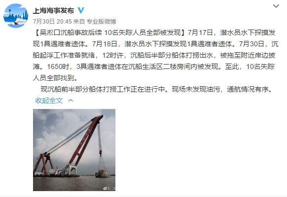 据上海海事局官方微博消息,7月17日,潜水员水下探摸发现1具遇难者遗体。7月18日,潜水员水下探摸发现1具遇难者遗体。7月30日,沉船起浮工作准备就绪,12时许,沉船后半部分船体打捞出水,被拖至附近岸边披滩。下午4时50分,3具遇难者遗体在沉船生活区二楼房间内被发现。至此,10名失踪人员全部找到。