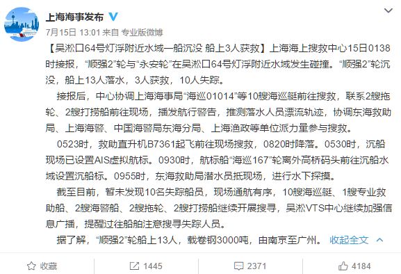 吴淞口沉船事故共有13人落水,其中3人幸存。(详细:上海吴淞口水域两船相撞致一船沉没 3人获救10人失踪)