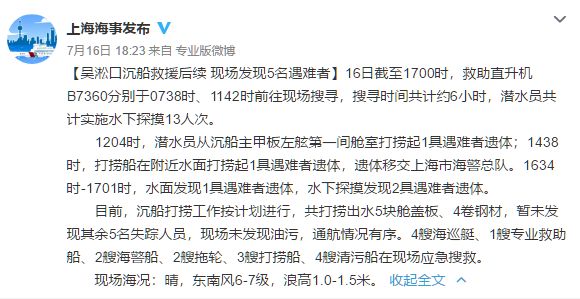 截至7月16日下午5时,救助直升机B7360分别于7时38分、11时42分前往现场搜寻,搜寻时间共计约6小时,潜水员共计实施水下探摸13人次,已发现五具失踪船员遗体。(详细:已发现五具遇难者遗体 上海吴淞口水域沉船搜救持续进行中)
