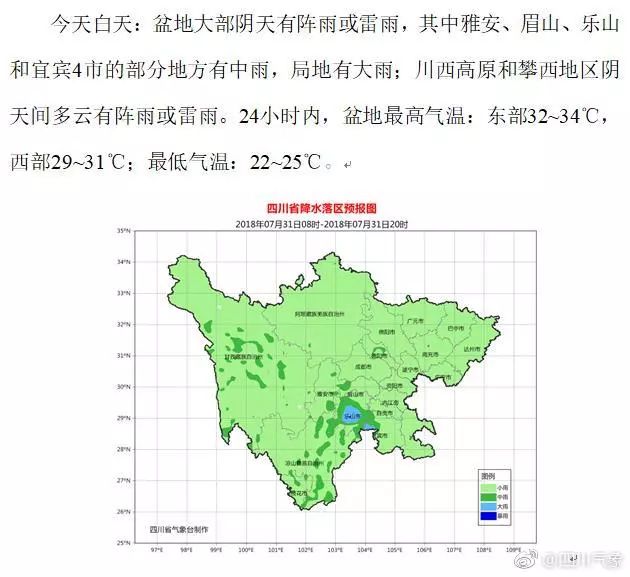 24小时内,盆地最高气温:东部32~34℃,西部29~31℃;最低气温:22~25℃。