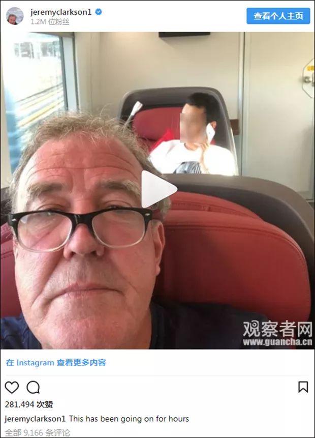 高铁上碰到男乘客持续大声打电话,克拉克森皱着眉头,对着镜头几近无声地喊了四遍“Shut up(闭嘴)!”