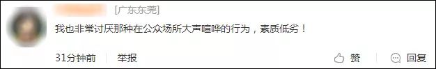 被视频曝光后,男子在高铁上持续大声讲话的行为受到了许多网友批评,认为在公共场所大声喧哗属于“素质低劣”。