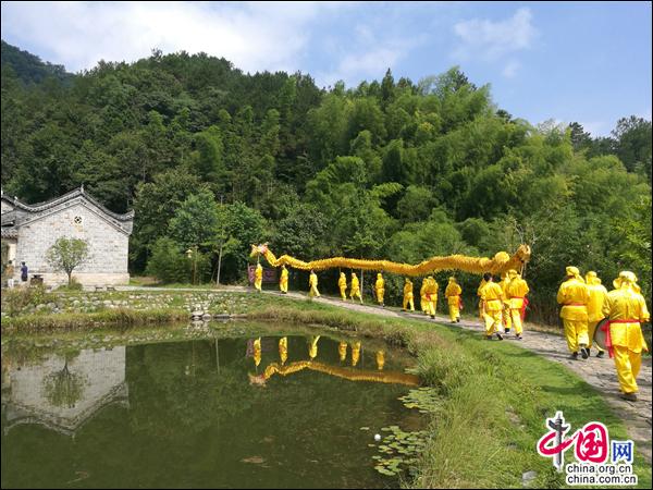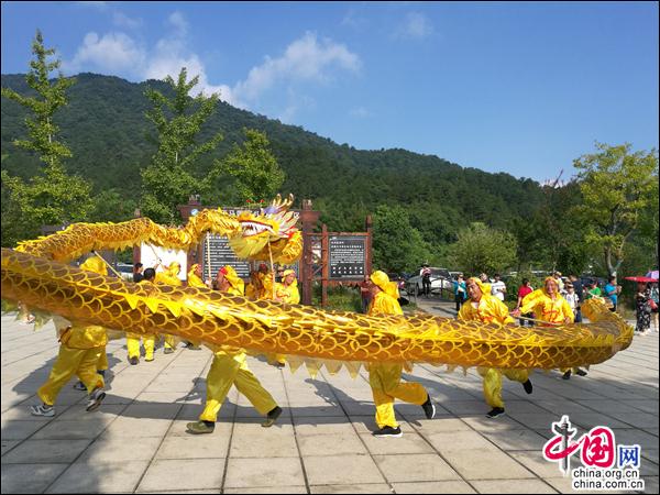 中国网8月6日讯 8月5日,周末,大别山安徽天堂寨景区大门前锣声阵阵,金龙狂舞,即便在晴空烈日下依旧吸引了大量游客驻足观看,更有不少青年游客接过舞龙艺人手中的舞龙棒,直接参与到舞龙队伍中,玩的不也乐乎。