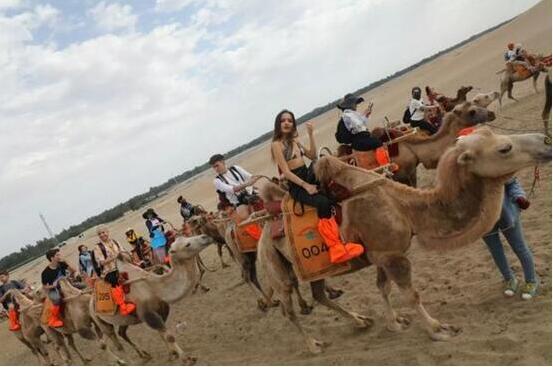 西班牙网红在敦煌鸣沙山·月牙泉景区体验骑骆驼(图片来源:甘肃省旅发委)