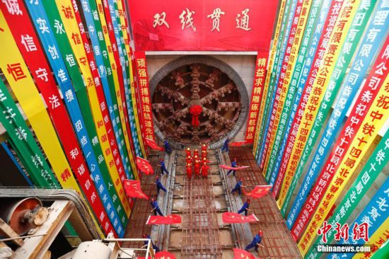 8月28日,随着巨大盾构机刀盘“破土而出”,缓缓抵达接收井,北京轨道交通新机场线最长盾构区段实现贯通,为机场线全线按期通车运营奠定基础。当日,北京轨道交通新机场线中距离最长、施工难度系数极大的盾构区间实现双线贯通。据建设方介绍,目前新机场线一期建设进度乐观,预计明年可全线贯通并开始试运行。中新社记者 富田 摄