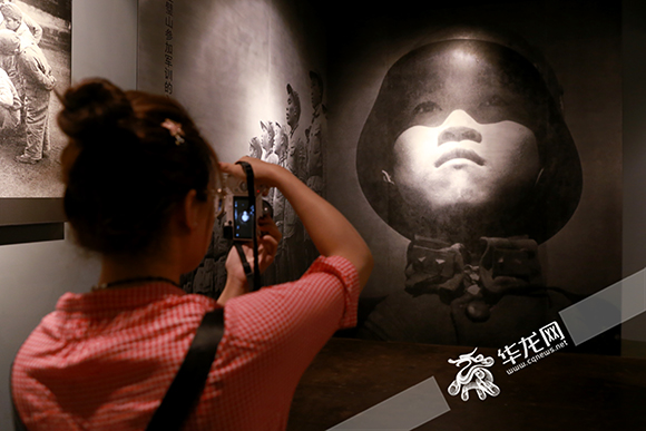 一名记者被墙上抗战先烈的肖像吸引了,并用相机记录了下来。记者 谢鹏 摄