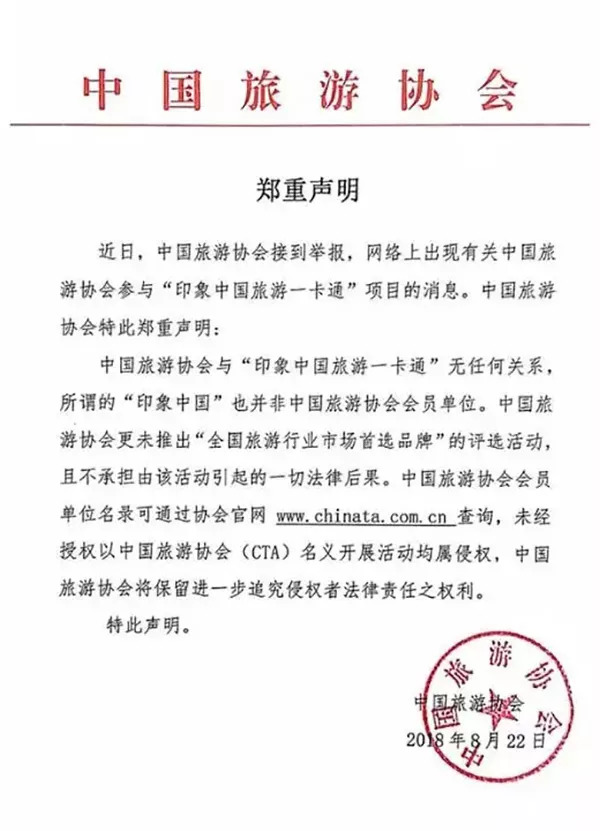 8月22日,中国旅游协会发声明称,中国旅游协会与“印象中国旅游一卡通”无任何关系,所谓的“印象中国”也并非中国旅游协会会员单位;中国旅游协会更未推出“全国旅游行业市场首选品牌”的评选活动,且不承担由该活动引起的一切法律后果。