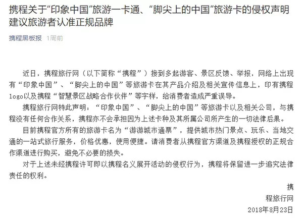 此后,携程、同程旅游、途牛、马蜂窝旅游网、驴妈妈等平台均发表声明称,与“印象中国”不存在任何形式的合作关系。