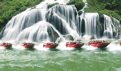 张家界西线旅游景区引进的新西兰飞艇穿越茅岩河瀑布