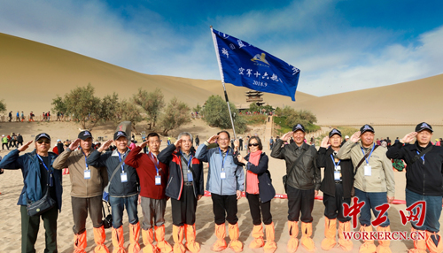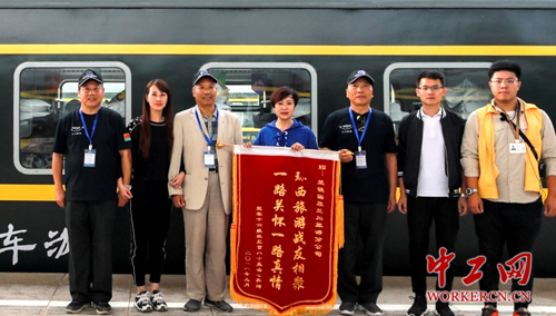 17日上午返回兰州站,“老兵”代表为兰铁国旅兰州旅游分公司赠送一面锦旗表达感谢:“环西部游战友相聚,一路关怀一路真情。”他们还争先在车体“环西部火车游”LOGO前拍照合影留念,留下了这次旅行的难忘一刻。