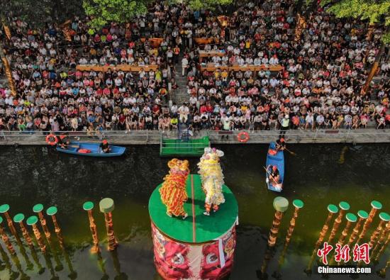10月1日,广东佛山西樵山,为期两天的2018“黄飞鸿杯”第十四届世界华人狮王争霸赛暨水上双狮挑战赛吹响号角。中新社发 陈世江 摄