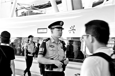 北京南站派出所民警在站台开展工作