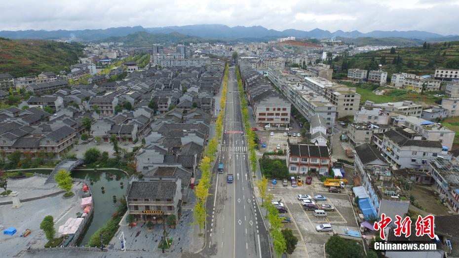 10月15日,贵州省瓮安县,千年古邑区内笔直的公路。草塘千年古邑区坐落于贵州省黔南布依族苗族自治州瓮安县猴场镇,距今已有千余年历史。它是贵州历史上著名的商业重镇,汇聚了土司、商贾、红色等文化,有着川湘滇黔民风民俗的深厚文化底蕴。目前,该古邑区作为中国4A级旅游景区,是贵州省重点打造的100个旅游景区之一,2014年荣获中国最具价值文化(遗产)旅游目的地。中新社记者 瞿宏伦 摄