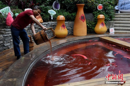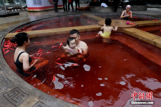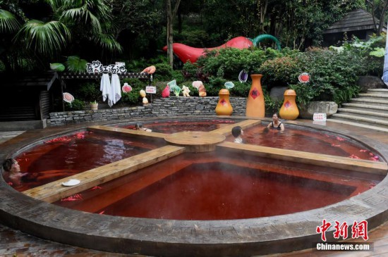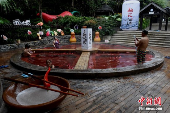 10月18日,市民正在泡“火锅”温泉。重庆一温泉近期推出“奇妙的红汤池”,直径6.7米的圆形汤池被改造成一口4格“铁锅”,配上红色的温泉,如同巨型麻辣火锅。“火锅”温泉汤池里的“火锅底料”是用鸡血藤、艾叶、红花、首乌等中药材加上红酒熬制而成,对人体有一定保健功能。汤池周边还陈列着盐罐、油碟、午餐肉、啤酒瓶等装置,水上漂浮着辣椒道具共同营造出麻辣火锅的浓烈气氛。 中新社记者 周毅 摄