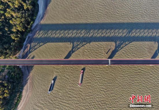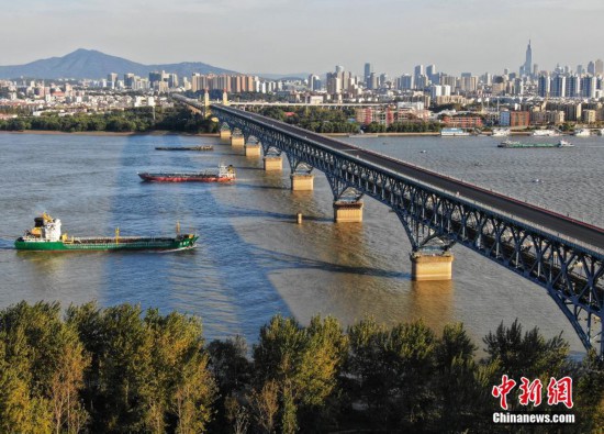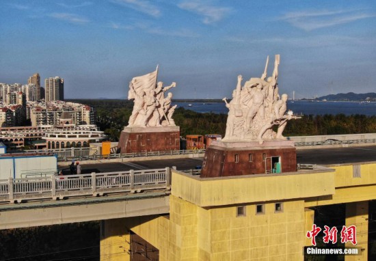 10月18日,航拍封闭维修中的南京长江大桥。日前,正在进行维修改造工程的南京长江大桥主桥桥面摊铺沥青,桥头堡及雕塑等处的围挡也已拆除,露出崭新的形象。据悉,整个维修改造工程预计2018年年底前完成并恢复通车。中新社记者 泱波 摄