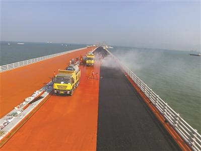 港珠澳大桥桥面铺装规模达70万平方米,其中50万平方米为钢桥面,是目前世界最大规模的钢桥面铺装工程。桥面铺装层采用GMA浇筑式SMA沥青混凝土铺装方案,根据“露天工厂化”施工理念,创建了世界一流的集料生产线,首次引进车载式抛丸机,研制了防水层机械化自动喷涂设备,有效提高了施工质量和效率。2014年6月,完成大桥试验段施工,组合梁和钢箱梁桥面铺装随即全面展开,到2017年7月27日,桥梁工程桥面铺装圆满完成,主桥桥面铺装这条战线整整历时四年。