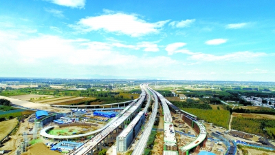 “一年多前,刚进场时候这里的确很偏僻,但是现在已经可以想象明年通车后的现代化交通景象。”站在项目的西侧高架桥上,谢刚介绍,本标段为分离式互通立交,中间夹着京雄高铁、机场快轨,高架桥下几乎垂直横穿而过的是北京大兴国际机场北线高速公路,等到明年全部通车,汽车、高铁、地铁并行,看上去一定很壮观。