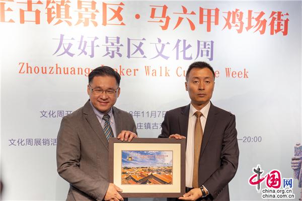 中国网11月8日讯 为庆祝周庄古镇景区与马六甲鸡场街景区结为友好合作景区一周年,11月7日上午,由江苏水乡周庄旅游股份有限公司主办,马来西亚·马六甲历史城区(鸡场街)工委会联办的周庄古镇景区-马六甲鸡场街友好合作景区一周年庆活动在周庄古镇顺利开幕。马六甲历史城区(鸡场街)工委会常务副主席拿督威拉颜天禄携代表团一行,昆山旅游度假区管委会副主任董建国、周庄镇镇长石颖、昆山市工商联主席俞武军、市侨办副主任汤志轩、周庄镇党委委员徐学新、副镇长黄萍出席开幕式,周庄镇党政办、招商中心、宣传办、服务业办、文体站、旅服中心、旅游公司、商会等部门单位相关负责人参加开幕式。