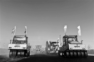 昨天上午10点,北青报记者在北京大兴国际机场高速公路施工现场看到,施工人员正在对道路摊铺中层沥青。
