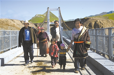 江前村是坐落在果洛藏族自治州阿尼玛卿雪山下的一个牧业村。过去,由于缺桥少渡,牧民出行和牲畜转场时,夏天涉水、冬季履冰。“我们村子前边有一条十多米宽的河流,水大时村民过河常会掉进去,数千头只牛羊被冲走。2005年,政府在河上架起了大桥,公路一直通到县里,这可是全村少遇的大喜事。”75岁的藏族老人美江说。
