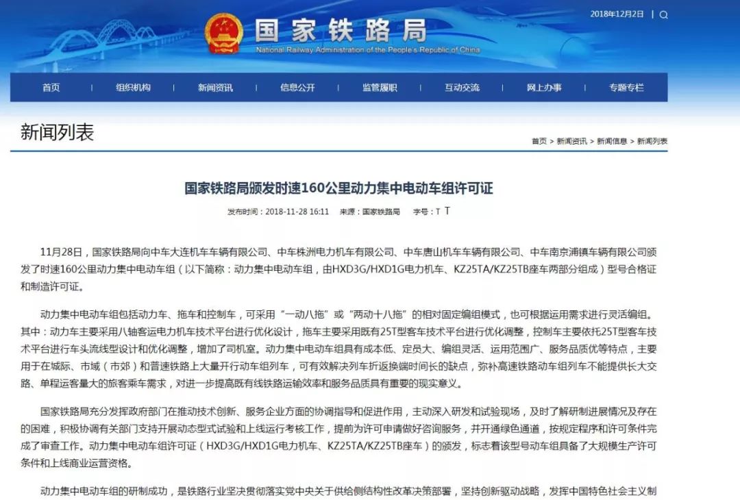 11月28日,国家铁路局刚刚向中车大连机车车辆有限公司、中车株洲电力机车有限公司、中车唐山机车车辆有限公司、中车南京浦镇车辆有限公司颁发了时速160公里动力集中电动车组型号合格证和制造许可证。为动集上线做好了铺垫。