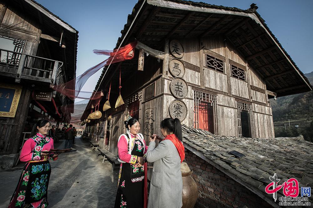 “走马羌寨”, 是四川省绵阳市平武县牛飞村的别名。走进牛飞村,身着艳丽羌族服饰的“女寨主”沈艳燕按照羌族习俗向来客献上“羌红”和迎客酒。“献羌”是羌族庄重的礼仪形式,祝福来客万事如意。每当旅游旺季或者羌族的重大节日,热情好客的羌族人便会载歌载舞,欢迎远方的客人。中国网 伦晓璇 摄