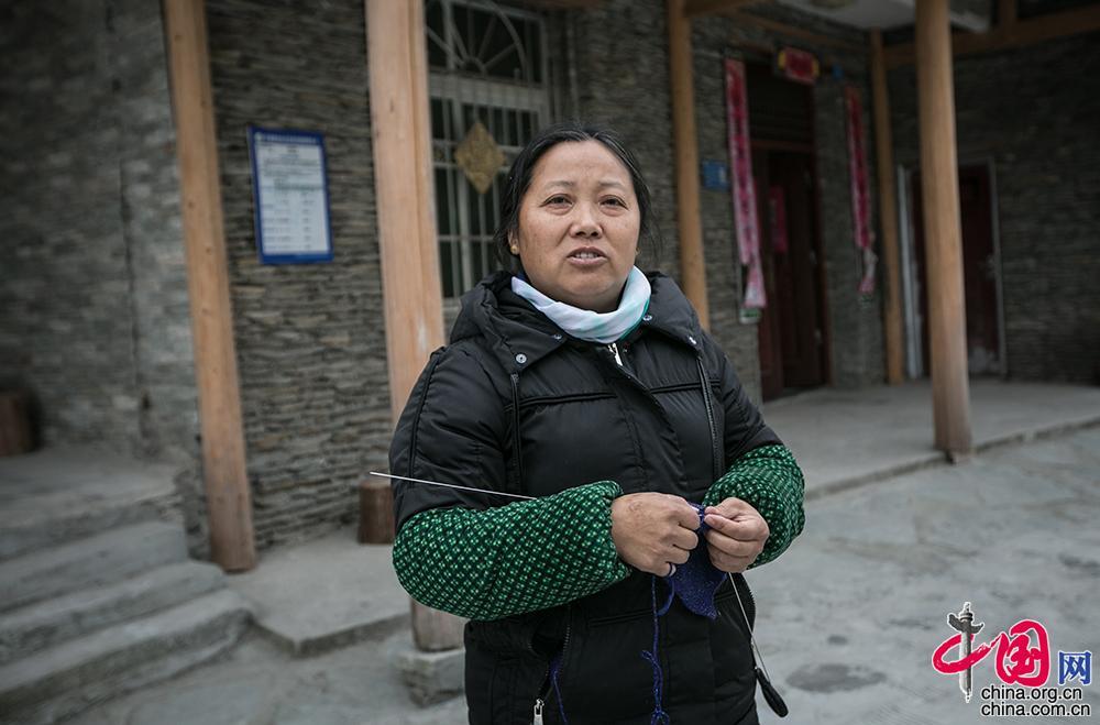 村民袁德菊是绣坊里的一名绣娘,从09年开始学习羌绣。只要绣坊接到订单,便会分给绣娘们制作。绣娘们足不出户就能在家里完成绣品。有绣活的时候,袁德菊一个月可以凭借羌绣收入两三千元, 有时还要熬夜加班赶制绣品。“钱也挣了,家里也打理了”,袁德菊笑着说。中国网 伦晓璇 摄