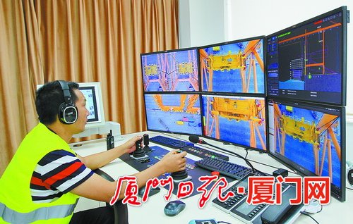 桥吊远控系统实现坐在办公室里装卸集装箱。 (本报记者 王协云 摄)