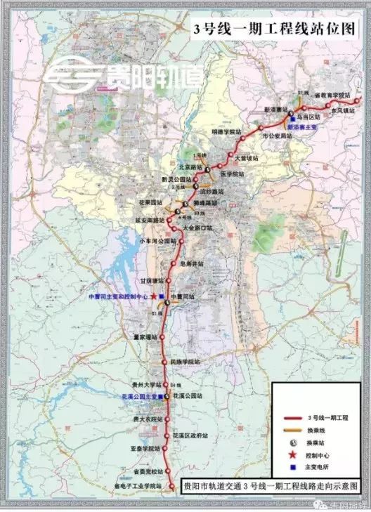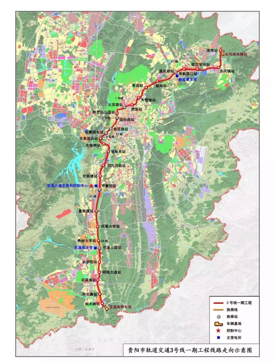 轨道交通3号线一期工程全长43.03公里,起于花溪区桐木岭,经过经开区、南明区、云岩区,止于乌当区洛湾,共计29座车站和28个区间,设1个车辆段、1个停车场、3座主变电所和1个运营控制中心。