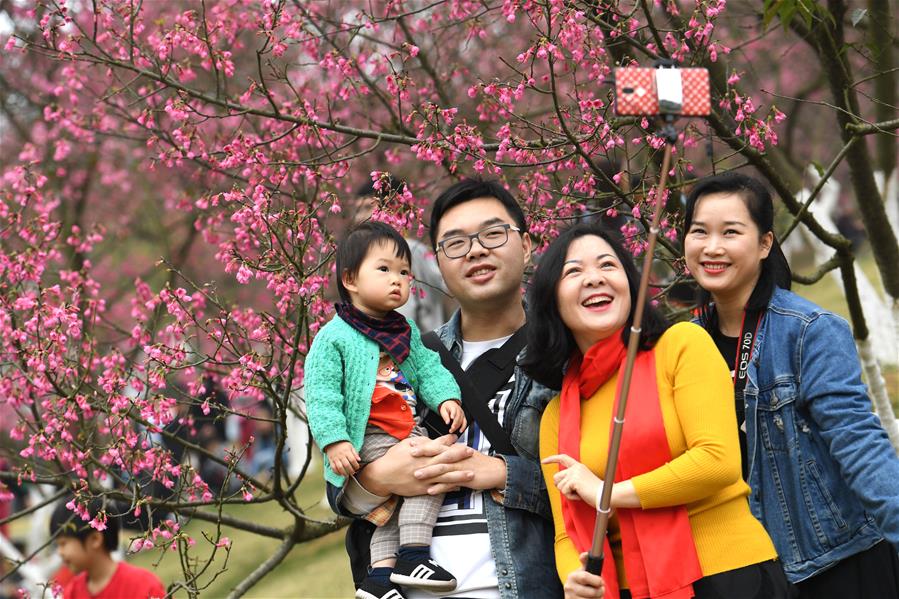 2月5日,游人在南宁市石门森林公园樱花林里自拍。 新华社记者 周华 摄