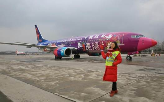 停机坪上这架彩绘飞机吸引了众多旅客的目光。