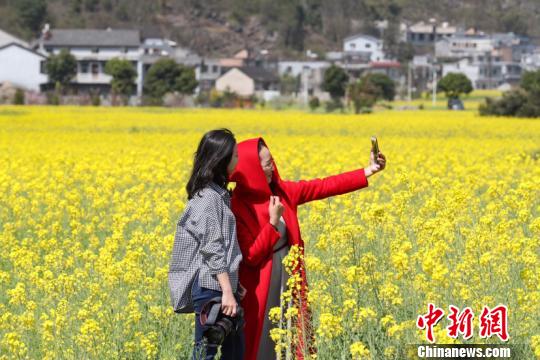 贵州兴义万峰林油菜花吸引游客拍照留念。贺俊怡 摄。
