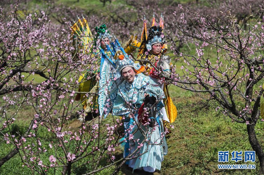 3月23日,身着传统服饰的演员在桃园中表演“新登竹马”。新华社记者 徐昱 摄