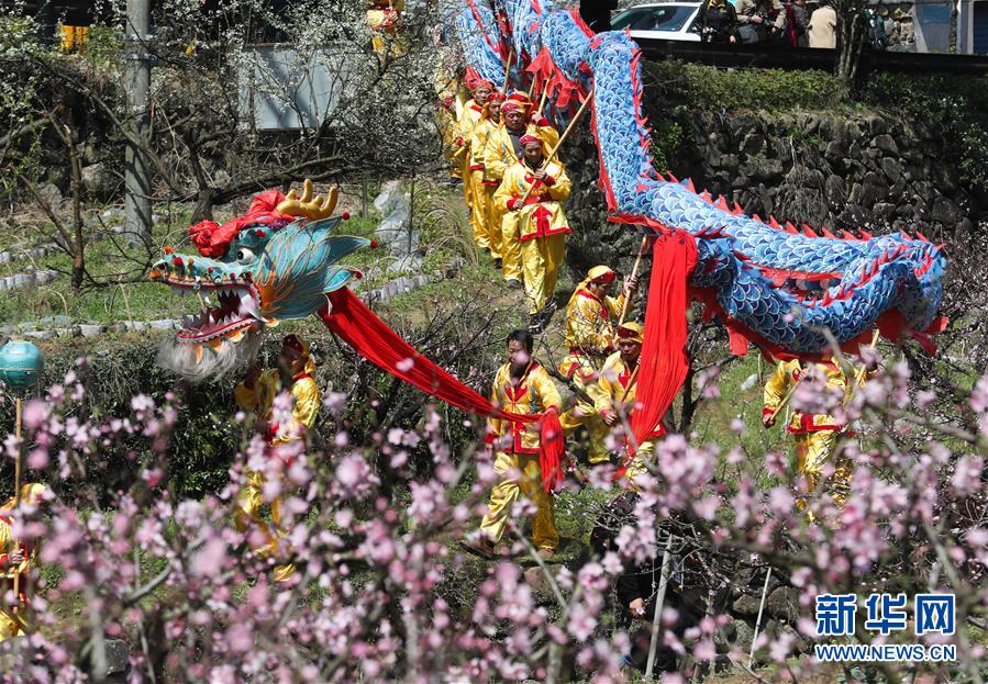 3月23日,演员在桃园中表演传统舞龙。新华社记者 徐昱 摄