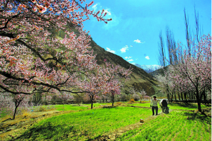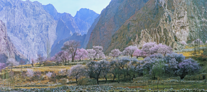 每年三四月间,在塔吉克族老乡的房前屋后,百年的杏树遮天蔽日,一束束花朵在枝头绽放,灿若云霞。冷峻的雪山和苍茫的峡谷围着杏花林,形成强烈的视觉对比,如梦似幻。