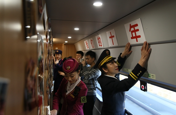 3月31日,旅客拍摄正在布置石太客运专线十周年图片展的列车工作人员。