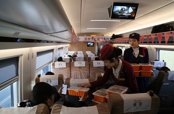 3月31日,石太客运专线工作人员为旅客送餐。新华网 薛枫摄