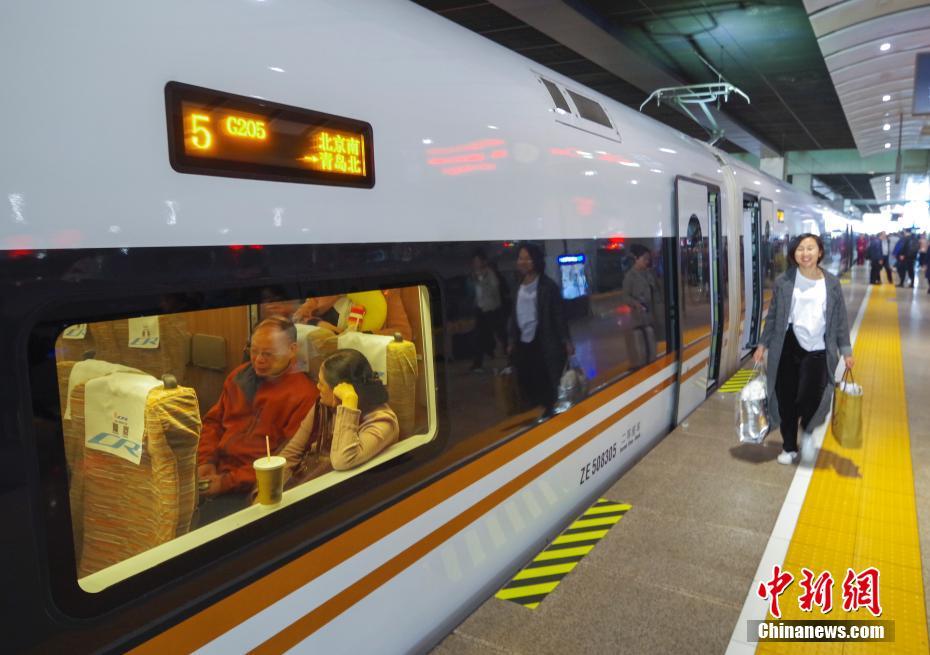 4月10日,G205次“复兴号”动车组停靠在北京南站,旅客有序乘车。当日,全国铁路实施新的列车运行图。G205次是铁路调图后,北京到青岛一站直达的首发提速高铁。北京到青岛间的运行时间首次被压缩进了3小时,全程共2小时58分。中新社记者 贾天勇 摄
