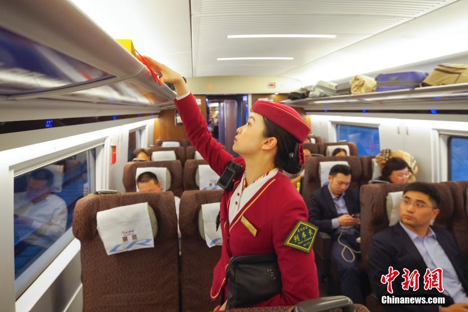 4月10日,北京南站,G205次“复兴号”动车组发车前,列车长牛鑫馨在车厢内整理行李架。当日,全国铁路实施新的列车运行图。G205次是铁路调图后,北京到青岛一站直达的首发提速高铁。北京到青岛间的运行时间首次被压缩进了3小时,全程共2小时58分。中新社记者 贾天勇 摄
