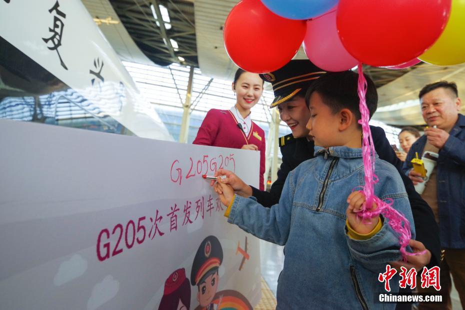 4月10日,北京南站,G205次“复兴号”动车组发车前,小乘客在纪念版上写字留念。当日,全国铁路实施新的列车运行图。G205次是铁路调图后,北京到青岛一站直达的首发提速高铁。北京到青岛间的运行时间首次被压缩进了3小时,全程共2小时58分。中新社记者 贾天勇 摄