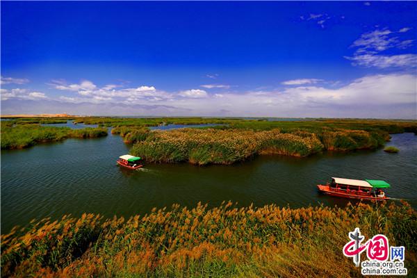 本次赛事活动的主阵地之一——宁夏沙湖,融合了江南水乡之灵秀与塞北大漠之雄浑,以自然景观为主体,沙、水、苇、鸟、山五大景源结合构成,被誉为“世间少有”的文化旅游胜地。依托于沙水相依的独特资源禀赋,沙湖处处是景,步步皆诗,是国家AAAAA级景区以及中国十大魅力湿地之一。